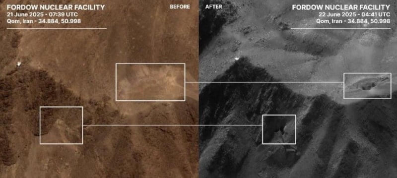 Görüntüler; ABD hava saldırıları sonucu Fordow'daki yeraltı kompleksinin hemen üzerindeki bir sırtın tepesinde en az 6 mühimmat giriş deliği/krateri olduğunu gösteriyor.