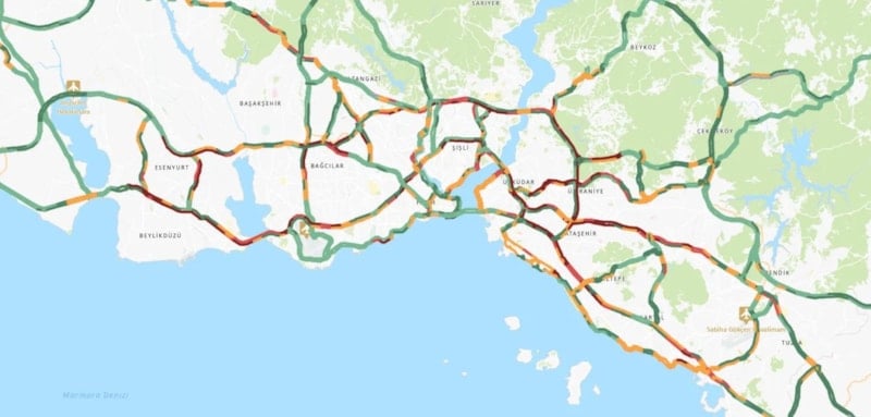 İBB Cep Trafik verilerine göre, saat 15.41'de kent genelinde trafik yoğunluğu yüzde 76'ya kadar çıkarken Anadolu Yakası'nda yüzde 83, Avrupa Yakası'nda ise yüzde 71'e ulaştı.